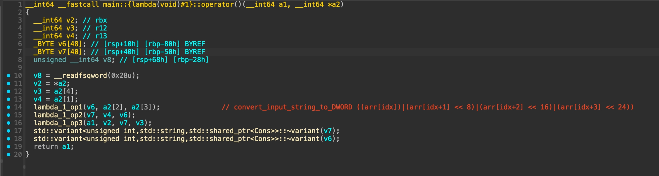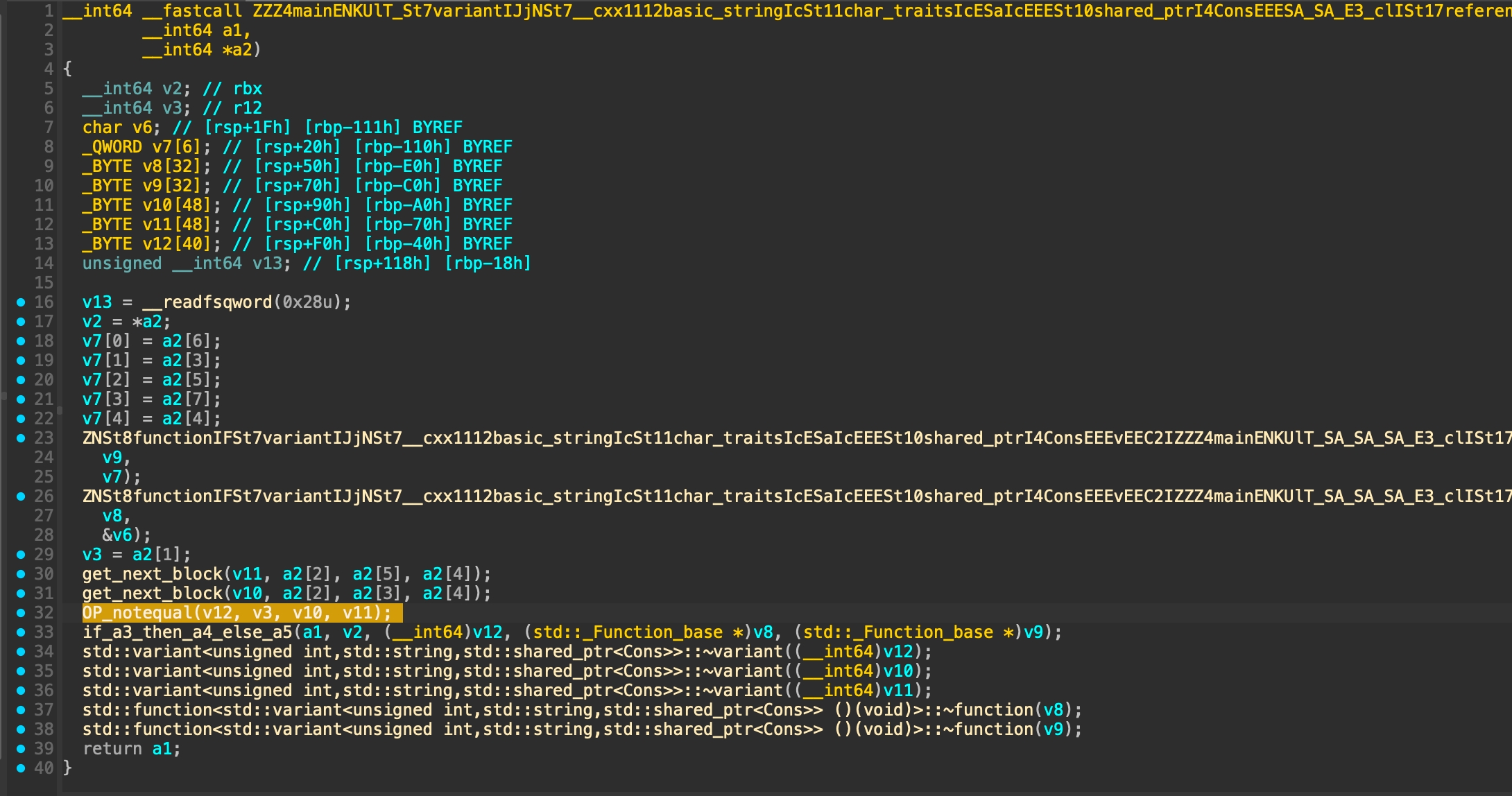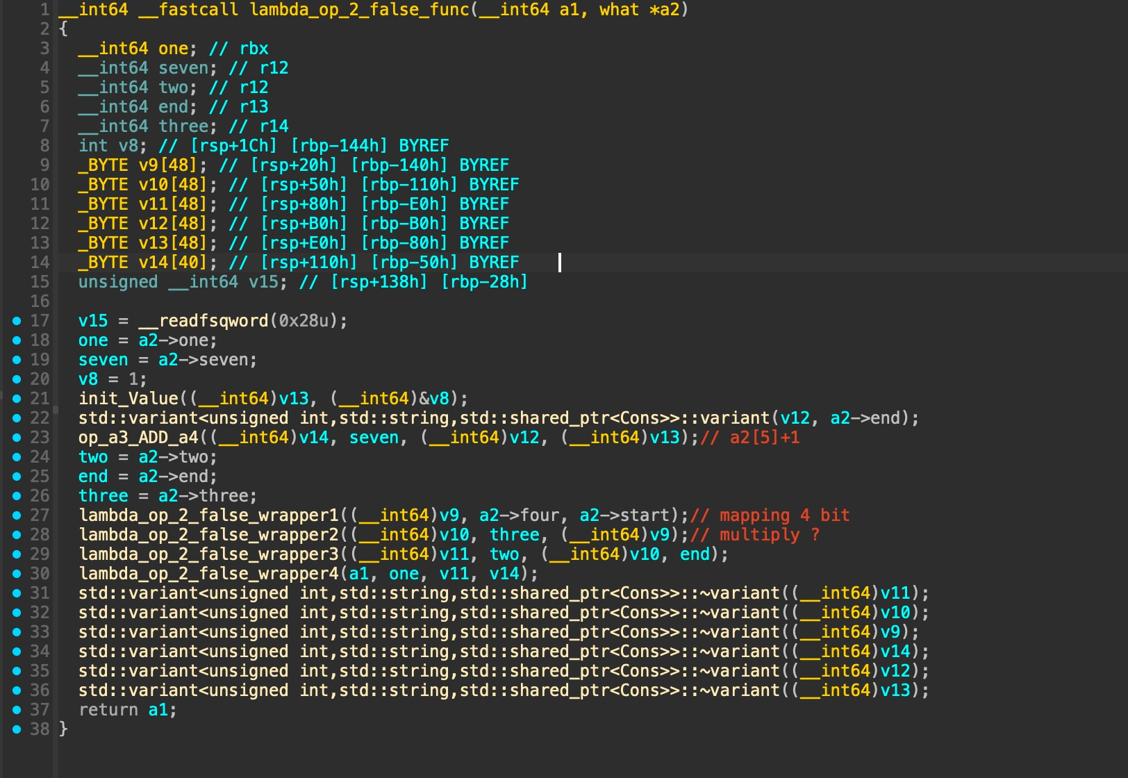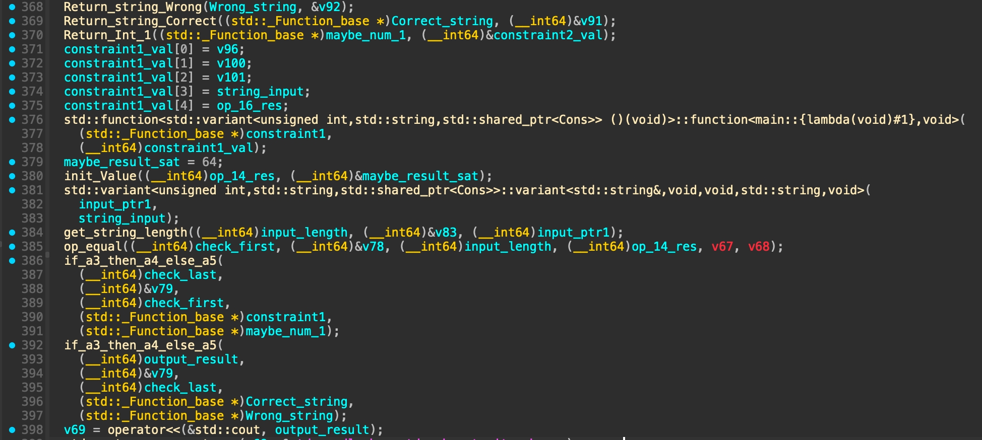 Above code basically doing validation for the result from function std::function<std::variant<unsigned int,std::string,std::shared_ptr<Cons>> ()(void)>::function<main::{lambda(void)#1},void>(