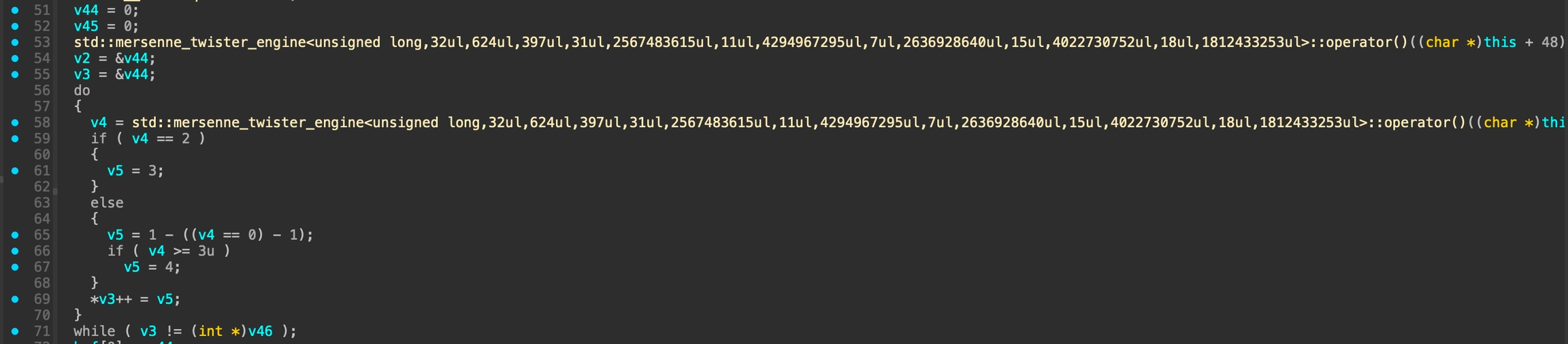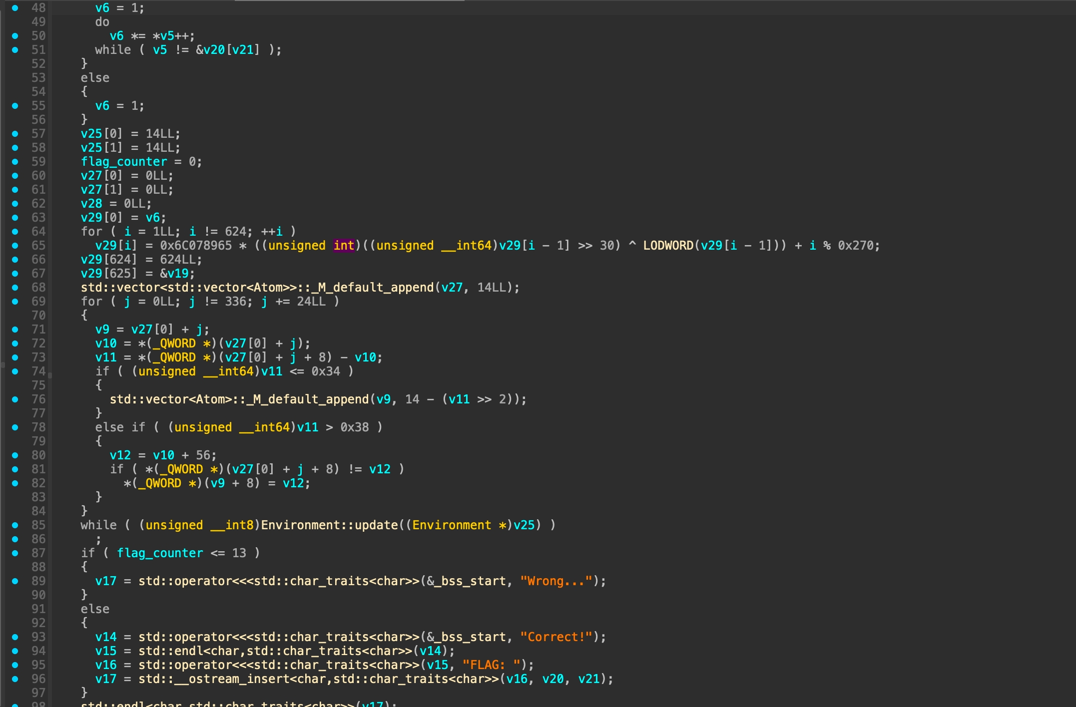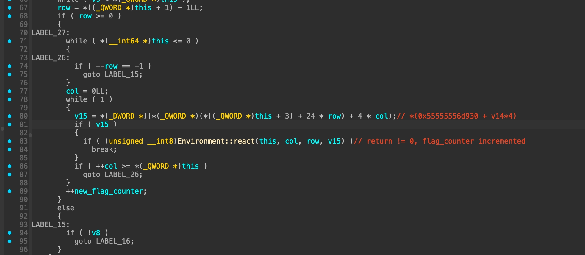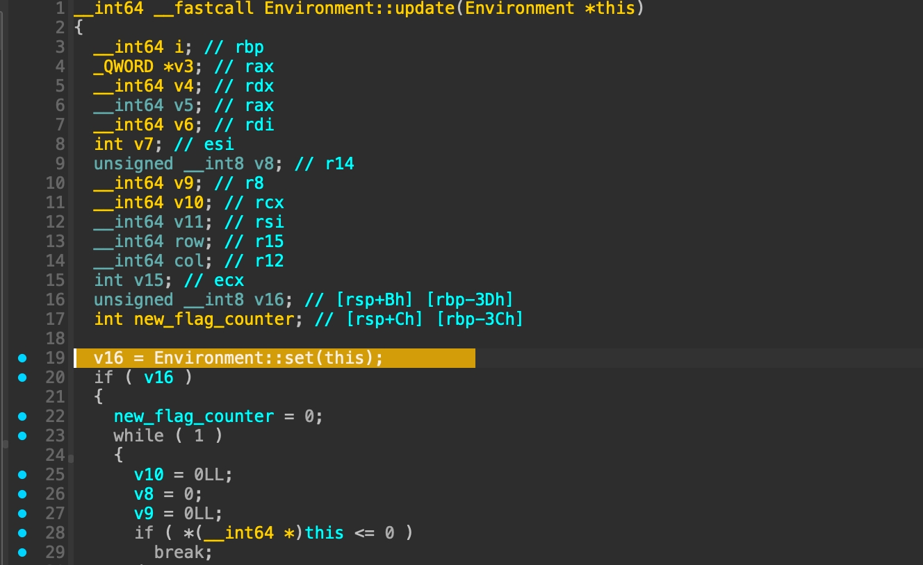 The output doesnt look like a value in maze. So i continue to analyze the algorithm that will process above values. Our objective is to findout a way to make the flag_counter > 13 and i found that Environment::react will affect the flag_counter.